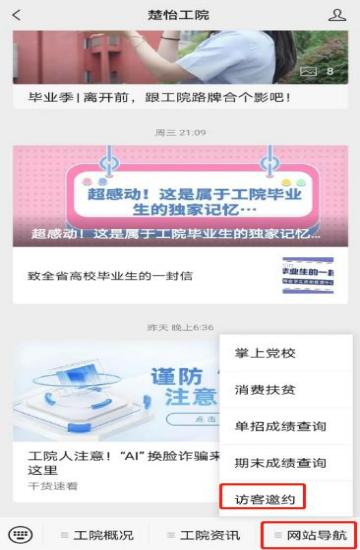 第一步:微信关注“楚怡工院”公众号,在“网站导航”中点击“访客邀约”。