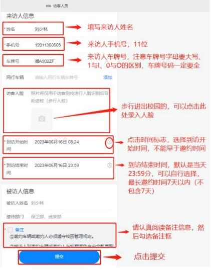 (邀约人员 (本校老师) 填写):点击“登记访客信息”,填写来 访人的信息资料,带*号为必填项,车辆进入输入车牌号,步行 进入录入人脸,两者选其一;填写完后点击提交,返回到预约界 面,点击通过完成。