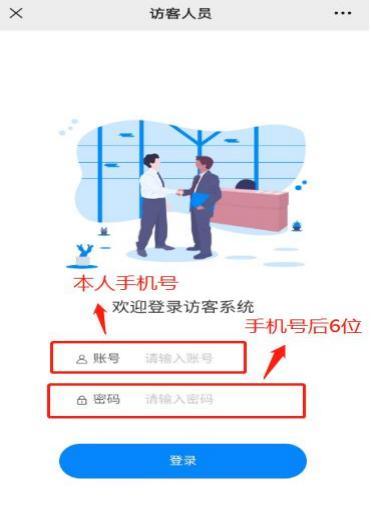 第二步:进入访客登记页面,填写访客信息。账号:本人手机号码 密码:手机号码后六位。(温馨提示:请及时修改密码)
