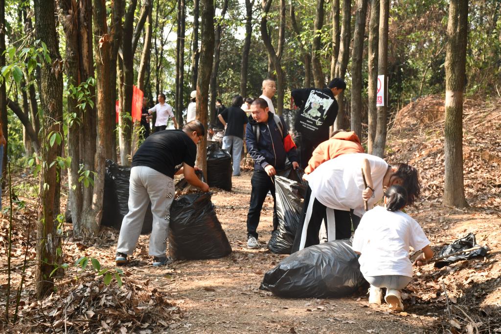 志愿者分成三组深入鹤鸣山林间,对林间主干道路及两侧的干树枝、枯叶、垃圾等进行有效清理。从山顶开始至山底,志愿者们分工明确,协力同心,用钢丝耙收集枯树叶、用镰刀清理干树枝,打扫林间主干道、捡拾干枯树叶并装袋搬运下山。志愿者们不辞辛苦,各司其职,任务繁重却有条不紊。