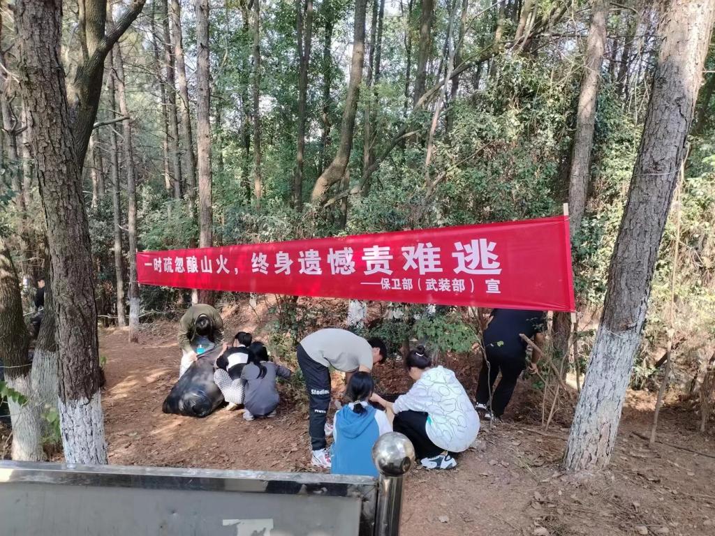 10月16日、25日,学校保卫部、武装部联合保利天创物业公司组织100余名师生志愿者在校内鹤鸣山开展“绿色呵护你我他,护林防火靠大家”消防安全隐患清理志愿服务行动,对鹤鸣山各类树枝树叶等消防安全隐患进行了再排查、再清理。
