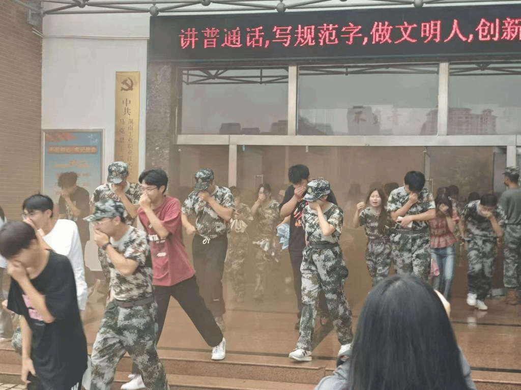 警哨声响起,知行楼和尚善楼瞬间被紧张的气氛笼罩。新生牢记军训中培养的纪律意识,迅速用捂住口鼻,弯腰,按照既定疏散路线,在教官们的带领下,从两栋教学楼中有序撤离。在撤离过程中,同学们相互扶持,展现出高度的团队精神和责任感。