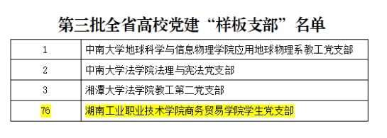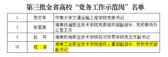 近日,湖南省高校党组织“对标争先”计划第三批项目评选结果公布,我校5个党建项目获评全省高校党组织“对标争先”建设计划第三批项目。其中,机械工程学院党总支、商务贸易学院学生党支部分别获评全省高校党建工作“标杆院系”“样板支部”,教师刘峥、程涛、邹洪富分别获评全省高校教师党支部书记“双带头人标兵”“党务工作示范岗”“青年教工党员示范岗”。同时,全省高校学习宣传贯彻党的二十大精神精品微党课评选结果揭晓,我校教师何静的作品《贯彻二十大,说说心里话——我眼中的民族团结一家亲》喜获一等奖。