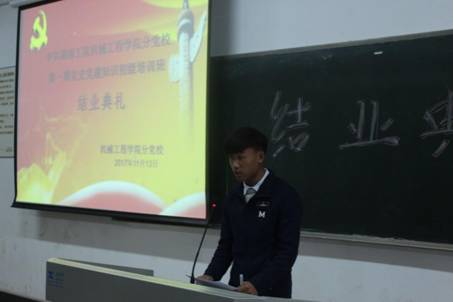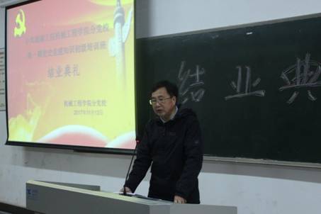 2017年11月13日,机械工程学院分党校第一期党史党建知识初级培训班结业典礼在2404教室举行,机械工程学院党总支书记、分党校校长马跃龙莅临本次仪式,学院全体辅导员出席仪式现场。仪式由培训班班主任、学生党支部书记罗德贤主持。