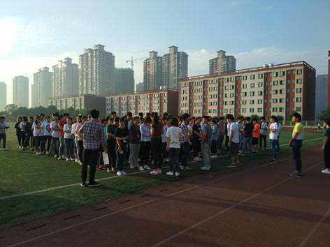 参加比赛共有九个组,每组15人,其中两人摇绳,13人跳绳,为了保证公平公正,从对方班级中选取一个计时、两个计数人员。进行完一段时间“热身运动”后,参加比赛的各组,按照排练时的方法有条不紊进行着为时三分钟的比赛,未参加比赛的学员则在一旁鼓掌观看呐喊助威,全场洋溢着欢乐和紧张的气氛。