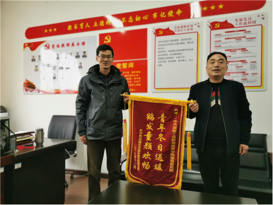 本网讯 近日,长沙市岳麓区含浦街道含浦敬老院王治国院长及一名陪同人员来到学校党校,为我校送上一面写有“青年冬日送暖 鹤发童颜欢畅”的锦旗,表达了敬老院老人们对党校全体师生学员的深深谢意。学校党校副校长陈方代表党校接受了锦旗。