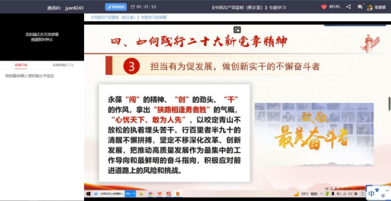 此次线上党课使全体学员了解了修改中国共产党章程的必要性和重要意义,也激发了学员们对党章的学习热情。实现中国式现代化必须坚持以人民为中心,全面践行新党章精神。全体学员一致表示,将切实做到旗帜鲜明、不忘初心、担当有为、清正廉洁,做一个坚定的践行者、忠实的服务者,将伟大建党精神与伟大自我革命相结合,为实现建设中国特色社会主义现代化强国的宏伟目标贡献自己的力量。