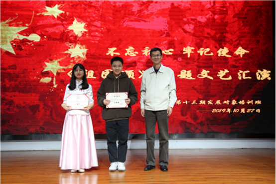 精彩纷呈的表演中,穿插着党性知识竞答环节,学员们踊跃举手,积极上台发言,赢得满堂喝彩。本次节目评选采用现场评委老师打分进行最终工业设计与艺术学院荣获一等奖信息工程学院的计网2018-2班的刘坦诚感慨道,为了能够更好的表达“祖国颂”的主题,体现“不忘初心,牢记使命,发扬红色革命经典,传承革命先烈精神。因此选择的题材是民国第一女将军胡兰畦,她在革命的道路上历经坎坷,却依旧不忘初心,他认为那正是我们应该所要学习的。做为积极向党组织靠拢的当代青年,要向革命先辈不断学习,不断进步不忘初心,牢记使命,砥砺前行。