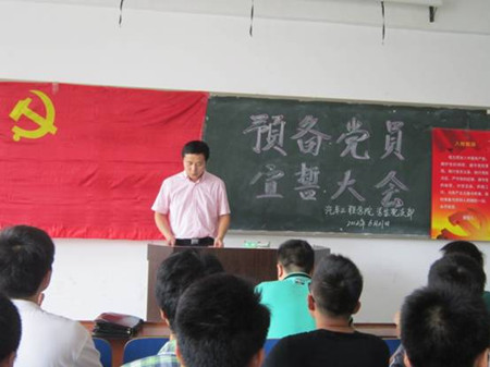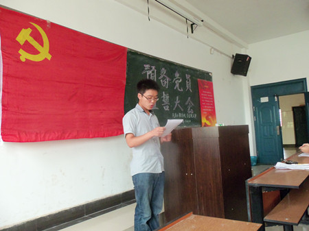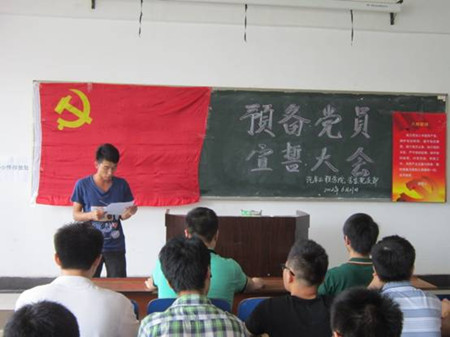 接着,新党员代表彭辉振、老党员代表钟玉京以及入党积极分子代表杨志明依次在会上作了发言。新党员代表彭辉振在发言中表示,作为一名预备党员要坚持党的理想信念,不断加强学习,做好本职工作,并时刻以身边的党员为榜样,严格要求自己。同时将铭记此刻在党旗下的庄重誓言,在以后的学习、生活和工作中将更加积极努力,多做贡献。钟玉京代表老党员在发言中也作了表态,他表示,作为一名学生党员,将更加严格要求自己,为学院、为支部贡献自己的力量。入党积极分子代表杨志明在发言中表明了向党组织靠拢的决心。他说,作为一名入党积极分子要以党员为榜样,坚持学习,并做到持之以恒,不仅要从组织上入党,更要在思想上入党。