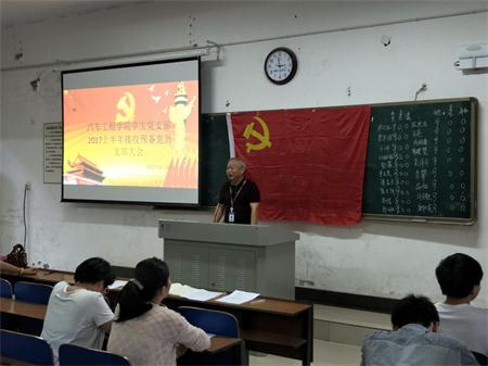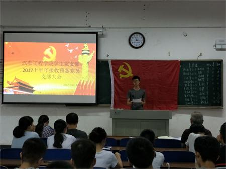 6月30日下午,汽车工程学院学生党支部在第二教学楼104教室召开2017年上半年接收预备党员大会。汽车工程学院党总支书记周理及学生党支部全体党员和本次党员发展对象、入党积极分子代表参加会议。大会由汽车工程学院学生党支部书记程涛主持。