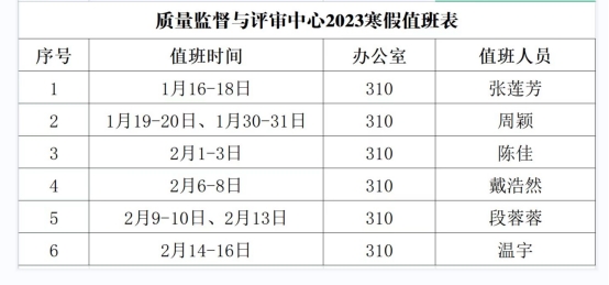 质量监督与评审中心2023年寒假值班表
