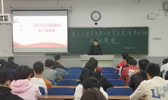 2020年11月10日下午15点30分,电气工程学院第六届党史党建初级培训班开班典礼结束后,在1212教室开展了《习近平谈治国理政》第三卷导读的党课学习。本次党课由电气工程学院党总支书记、分党校校长王俊主讲。
