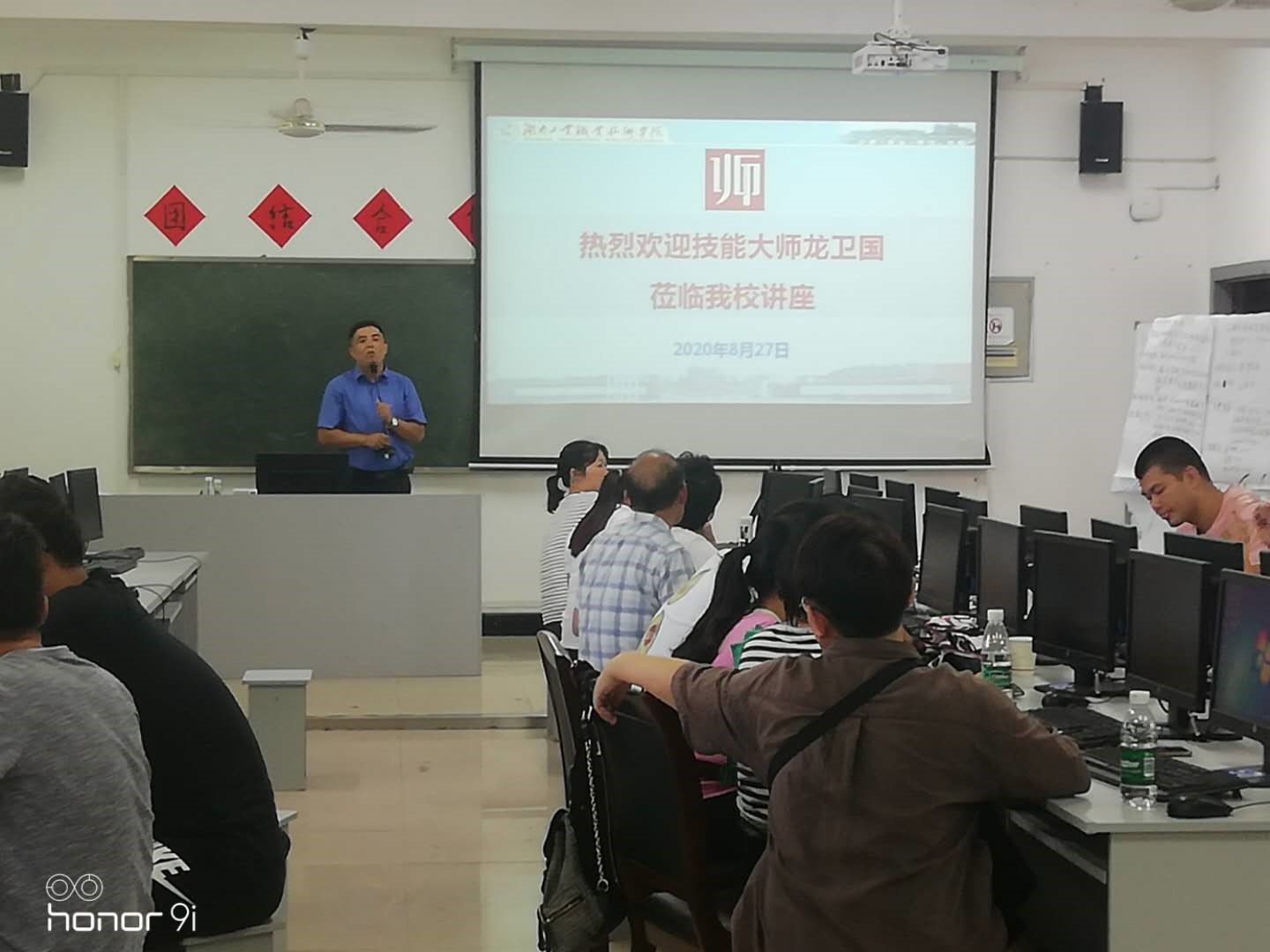 2020年8月27日电气工程学院邀请“大国工匠”龙卫国来我院为紧缺专业教师技术技能传承创新国家级培训班学员讲座。湖南省十三届人大代表、中联重科高级技师龙卫国,先后负责了全球最大的汽车起重机、全球最大的轮式起重机、全球最大吨位的五桥汽车起重机等20余项新产品的调试,被誉为“中国汽车起重机调试第一人”。多年来,龙卫国获得了享受国务院政府特殊津贴专家、全国技术能手、湖南省劳动模范、技能大师等多项荣誉。龙卫国分享自己一步步成长为“大国工匠“、”技能大师”的经验与感悟,传授他培养“工匠精神“的经验,指导如何在工作中创新创业,为紧缺专业教师技术技能传承创新国家级培训班学员上了精彩的一课。