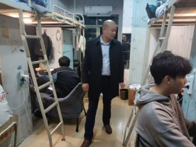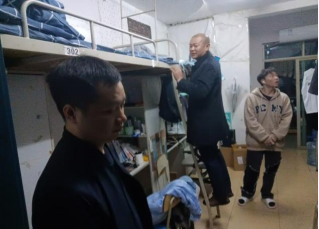 (院党总支副书记苏文凭检查上铺插座,副院长查看通风记录本)