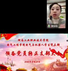 2022年12月31日,电气工程学院党总支电气与机器人学生党支部在线上召开了预备党员转正大会。会议由支部书记谭灿灿主持,支部全体党员参加。