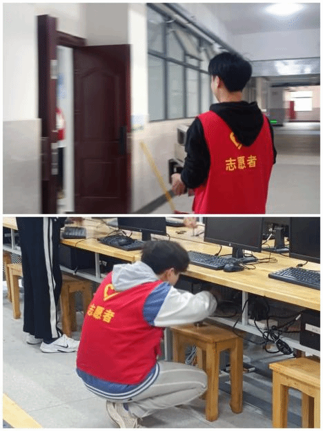 各位同学在统一的分配下,快速的到达各个工作点,为来我校参赛的选手引导,提供便捷服务;仔细打扫教室各个角落卫生,将各个实验器材整理整齐。