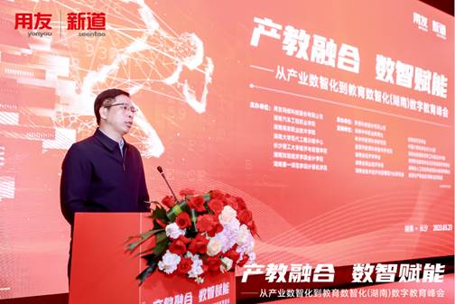 湖南省教育厅职业教育与成人教育处处长崔书芳出席会议发言。他谈到,怀进鹏部长在世界数字教育大会上对大力推进教育教学活动与数字技术融合发展进行了安排部署。本次峰会对推进教育数字化建设十分有意义,期待企业与院校一道探索教育数字化新理念、新政策、新机制,以数字化推进教育变革,打造具有湖南特色的智慧教育教学新模式。