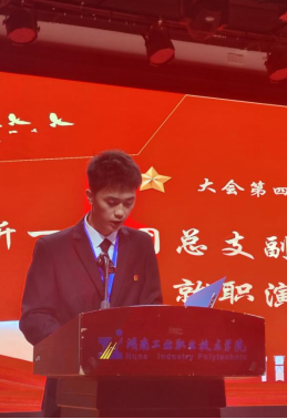 24届团总支副书记杨涛做就职演讲,他表示将以饱满的热情和坚定的信念,继承和发扬学院的优良传统,以服务同学为宗旨,以提升学院影响力为目标,在学风建设、活动创新、学生权益维护等方面积极作为,努力打造更具活力与凝聚力的电气工程学院团学组织。