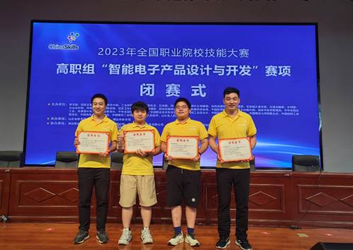 9月28日,2023年全国职业院校技能大赛高职组“智能电子产品设计与开发”赛项在山东烟台职业技术学院闭幕,我校由赵自鹏老师和刘志华、廖广、罗从善3名同学组成参赛队代表湖南省参赛,经过两天紧张激烈的比赛,从全国59支代表队中脱颖而出,荣获一等奖。