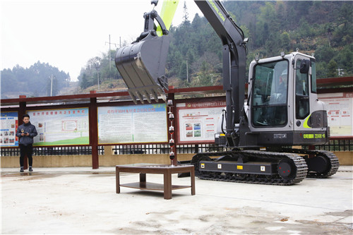 12月24日,在怀化溆浦葛竹坪镇回龙居委会前坪举行的“校企合作精准扶贫产教融合振兴乡村启动仪式”现场,挖掘机手操作挖机大秀技能,引得现场村民连声叫好鼓掌。