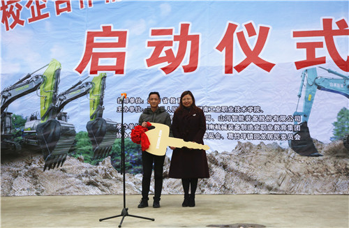 仪式上,我校协同中联重科、山河智能两家机械制造领头企业向葛竹坪镇捐赠两台挖掘机。葛竹坪镇回龙社区党支部书记向伟、葛竹坪镇横路村党支部书记夏洁分别从许智慧和肖伟手中接过了“挖掘机钥匙”。