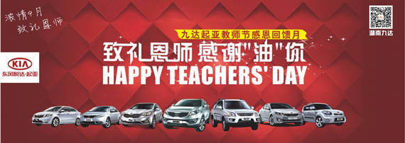 今年9月,一如既往,东风悦达起亚-长沙九达4S店专门为购车教师赠送丰厚的大礼,让广大教师车友享受到贴心的关怀。更多优惠详询长沙九达4S店0731-88812111。