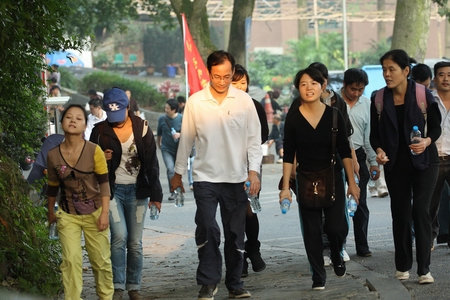 登山活动分登山比赛和健步登山两个阶段进行。比赛共分为男、女两队。学院工会主席张志勇在登山比赛前勉励大家要坚持锻炼身体,只有增强自身体质才能更好投入到工作中去,他同时提醒参赛选手在比赛过程中要注意安全。下午4点,比赛选手从湖南大学东方红广场出发,整个登山过程中,大家努力拼搏,团结互助,不断地互相加油鼓劲。男教师体力占优,在短时间之内即顺利完成了比赛,女同志巾帼不让须眉,埋头奋力向前,最终全部顺利登上山顶。