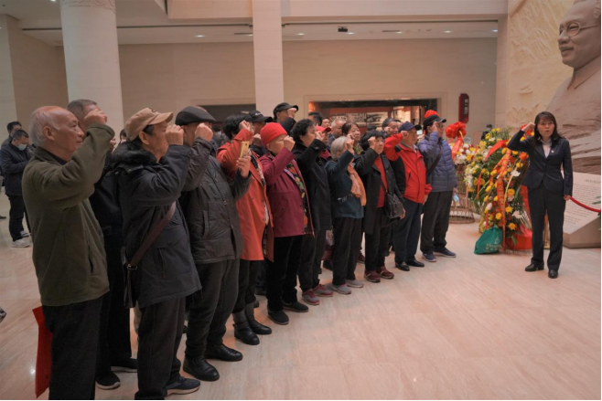 “我志愿加入中国共产党,拥护党的纲领……”,在“敢教日月换新天”的巨型雕塑前,离退休工会党总支书记廖佑莲带领总支党员重温入党誓词,庄严而坚定的宣誓声响彻党史陈列馆大厅。