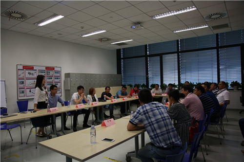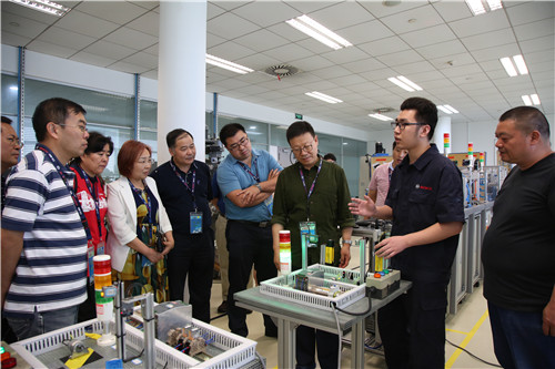 在博世公司TGA(双元制学徒中心)实训室,我校2016级现代学徒制订单班学生正在进行企业阶段的学习。5名学生一边熟练操作模拟生产线设备,一边向专家们现场解说传感器技术、电气控制技术和气动技术。