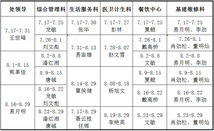 2、后勤处各科室组织完成假期基本建设与维修改造、校园环境卫生、师生餐饮保障、疫情防控等工作,未列入值班表的职工如有工作安排须及时到位。