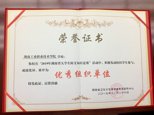 “2019年湖南省大学生防艾知识竞赛”由湖南省卫生健康委健康教育宣传中心主办,长沙市青彩防艾志愿者服务中心承办。2019年11月25日至12月10日,学生通过实名形式网上参与,完成50道防艾知识竞赛答题。据统计,全省高校共有239305名大学生参与了此次竞赛活动,参与答题人数排名前三十的高校获得“2019年湖南省大学生防艾知识竞赛”优秀组织单位荣誉。