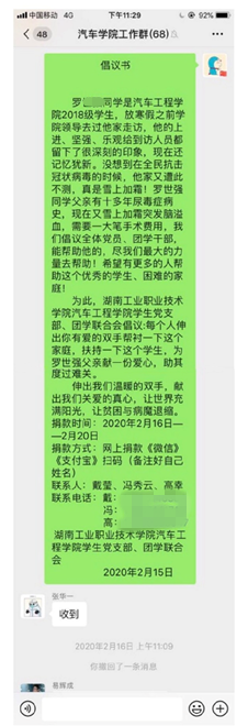 15日,汽车工程学院党总支书记胡正奎得知此事后与学院团学组织负责人、学生党员等进行沟通,了解到部分学生党员和入党积极分子已自发开始为小罗父亲捐款。随后,胡正奎在向分管领导汇报后,与汽车工程学院领导班子其他成员商量,以学生支部和团学联合会的名义呼吁学院党员教师为该生献上爱心,送去温暖。