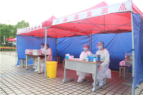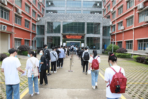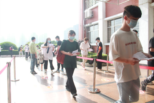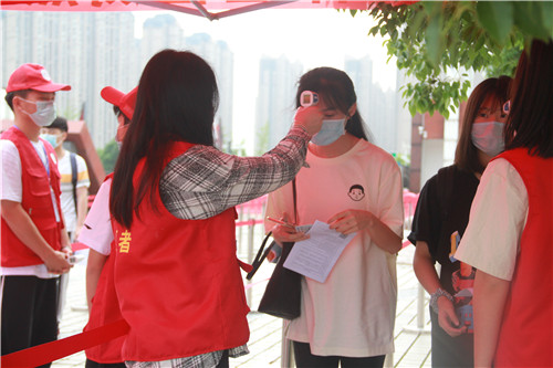 因疫情特殊时期,需要查看健康码、测体温、排队间距1m以上等步骤,增加的工作量并不影响学校工作人员和志愿者的服务热情,他们坚守岗位,确保考生的健康安全和方便。
