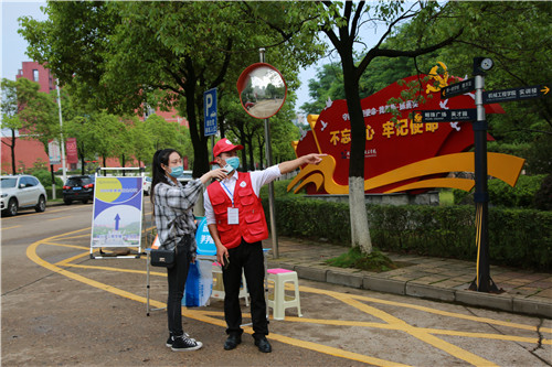 此次单招考试的一百多名学生志愿者均为居住在长沙的大一大二学生,接到学校“号召”的他们兴奋不已。“我能来学校当单招志愿者,其他不能返校的同学都很羡慕我呢!”数字媒体专业2019-2班的刘爽同学早上六点便到达“岗位”,与志愿者小伙伴一起在校园各拐角处引导考生顺利达到考场,并为有需要的考生提供口罩和饮用水。热情大方、语速略快、指引清晰,不少过路考生为这个笑眼盈盈的学姐点赞。