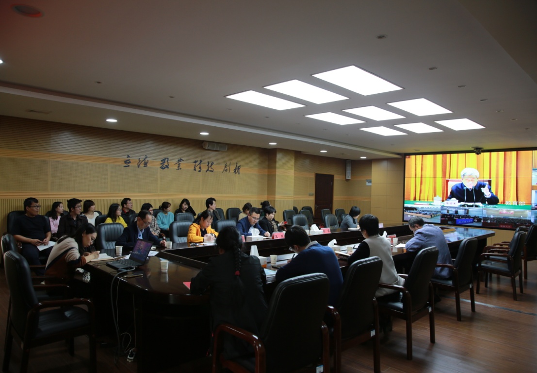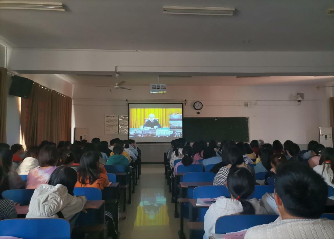 在办公楼二会议室,校党委副书记杨颖主持党委理论学习中心组的集中学习收看,全体在家校领导及中心组其他成员参加学习。15个二级党组织分别在各自党员活动室、会议室、教室组织了集中观看。