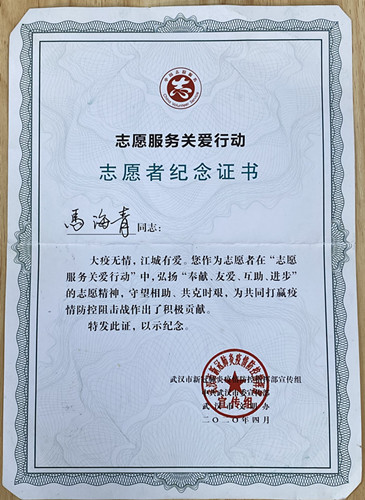 由于在疫情防控工作中表现突出,马海青先后获得了武汉市新冠肺炎疫情防控指挥部宣传组颁发的“志愿服务关爱行动志愿者纪念证书”、武汉雷神山突击队授予的“抗疫先锋”等荣誉。经学校推荐,马海青被评为湖南教育后勤协会疫情防控工作先进个人,同时湖南教育后勤协会推荐其参评全国教育后勤系统抗疫“2020年度感动人物”。“谢谢学校和后勤协会对我的肯定,我只是做了青年人该做的事。”收获荣誉,马海青表示,将继续做好自己的本职工作,用实际行动展现青年担当,为社会发展、人民幸福贡献力量。