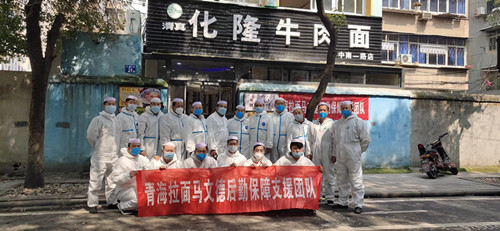 听说老家青海的首批援鄂医疗队抵达了武汉。马海青立即发了一条朋友圈,写道:“青海的天使们,我在这里24小时待命,不管你们在武汉哪家医院,都能吃上家乡的味道”,并公布了联系方式,双方很快就取得了联系。近百人的一日三餐,他和叔叔两个人忙不过来,便又在朋友圈发了一条信息,呼吁在武汉的老乡一起为医疗队做好后勤保障。很快,他们就组建起了一支志愿服务队伍。每天5点40分起床,除了拉面,还变着花样做炒面片、水饺,然后准时送到医疗队员手中。从最初的两个人、一辆车单打独斗,到后来20多人、8辆车的后勤保障支援团队,他们每天奔波在抗疫一线,一共为青海、山西、陕西等多地援鄂医疗队的医护人员送出了10000多份爱心餐。