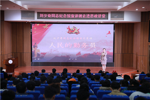 本网讯 “刘少奇同志为表达自己保卫炎黄子孙、振兴中华民族的志向,将自己的名字‘渭璜’按谐音改成‘卫黄’;求学期间,意识到要从小就应立奇志,要为国家民族的振兴奉献自己的一切,便改名少奇……”3月4日,我校迎来了2021年春季开学第一课。在图书馆报告厅内,由马克思主义学院联合刘少奇同志纪念馆组织开展的一堂特殊的沉浸式思政课堂——“聆听伟人故事,传承红色基因”反响热烈。