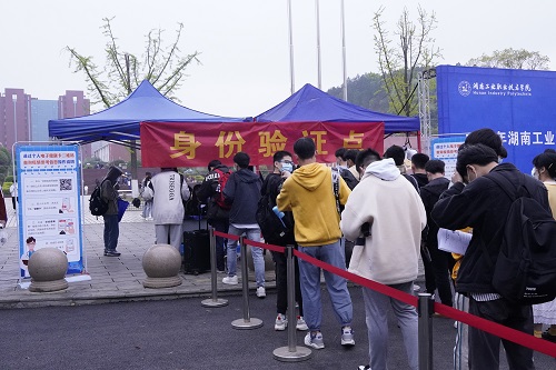 “请同学们佩戴好口罩有序地入场。”“同学,请测量体温。”……大门口,工作人员有序指挥,引导考生排队依次进入校园。