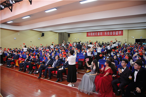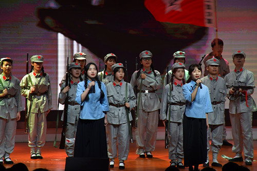 学校党委副书记杨颖、调研员刘琼、党委委员、组织人事处处长肖望兵带领全体师生唱响红歌《我们走在大路上》,现场党旗飘扬、声音激扬,彰显出工院师生意气风发、斗志昂扬的精神面貌。晚会在全体师生共同朗诵李大钊同志《青春》节选中圆满落下帷幕。