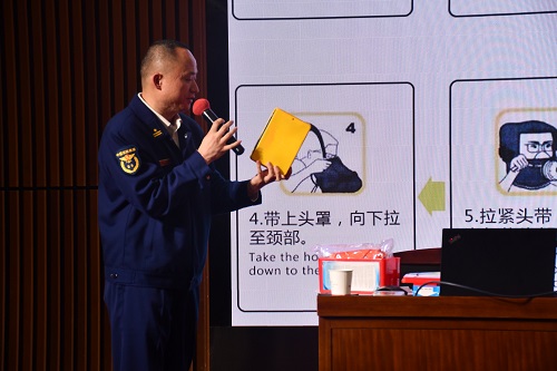 随后,李振现场示范讲解灭火器、防火毯、防毒面具的使用规范,并多次强调高校应重点关注学生寝室电线老化、漏电、长时间不拔电源等存在的安全隐患。