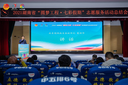 夏彬华以“感人肺腑、令人敬佩、与人共鸣”高度肯定了2021湖南省“圆梦工程·七彩假期”志愿服务活动的工作成效。他指出,此次活动有三大特点:一是重点突出,聚焦“防溺水”工作精准发力。围绕溺水是造成中小学生暑期意外死亡“第一杀手”的突出社会问题,坚持“疏与堵”相结合,采用“团干部+社会组织+志愿者”的模式,开展“防溺水”主题活动1500余场。二是难点突破,落实关爱行动开足马力。在疫情常态化背景下,充分调动资源,围绕庆祝建党百年、关爱青少年身心健康、新冠疫情防控等专题常态化、专业化、品牌化开展一系列关爱行动。七月底新一轮疫情防控阻击战打响以来,及时转换工作方式,全省动员12.9万名团员青年,组建2483支青年突击队、1141支青年志愿者服务队,在疫情防控中贡献青春的力量。三是亮点凸显,营造社会氛围提升活力。活动期间,广泛利用新媒体矩阵进行工作宣传,注重全民推广,凸显服务成效,共同营造了关注、关心、关爱青少年儿童的良好社会氛围。他强调,共青团开展关爱青少年儿童工作意义深远、责任重大,作为党和政府联系青年的桥梁和枢纽,广大共青团组织要进一步增强政治性、先进性、群众性,提升共青团的“三力一度”,在青少年儿童关爱服务体系中持续发挥生力军作用。