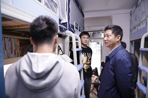 本网讯 11月29日,我校校长向罗生带队深入学生宿舍、建筑工地、食堂等地,检查指导学生管理、安全保卫、后勤服务相关工作。学校纪委书记王波,副校长成涛,学生工作处、校团委、保卫处、后勤处负责人及相关二级学院党总支书记等一同前往。