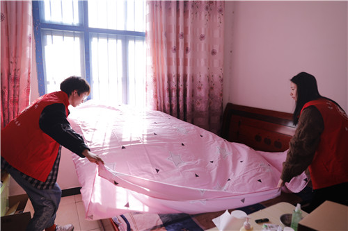 活动中,师生志愿者们和妮妮及其母亲一同参观了当地社区戒毒(康复)工作宣教室。来到妮妮家中,志愿者们送上了生活学习用品和慰问金。征得同意后,志愿者们将妮妮的卧室整理、装扮了一番,为她的小床换上了她喜欢的粉色调床单被套,并陪伴妮妮完成了学科作业。
