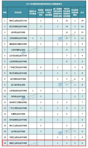 本网讯 2021年,是我校“十四五”规划的开局之年,也是我校科研业绩勇攀新高峰的一年。根据高职发展智库公布的2021年高职院校获国家级科研项目统计数据,我校获科研项目6项,位居全国第十八,湖南省第一,获立项的项目包括:第二批国家级职业教育教师教学创新团队课题1项,黄炎培职业教育思想研究规划课题3项,职业教育改革创新课题2项。