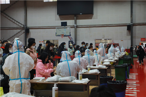 学校新冠疫情防控领导小组办公室于3月19日晚向全校发布紧急全员核酸检测通知,20日一早统筹调度后勤处、体育艺术部、校团委、保卫处、丹田物业公司等部门,在训练馆内快速布置18个检测台。学士街道斑马塘社区及学士街道卫生服务中心派出20余名医护人员进驻我校支持开展采样工作。