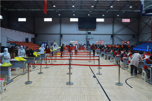 全体师生员工迅速响应号召,按照通知的时段分批有序前来训练馆,排队等候核酸采样。在志愿者的引导下,现场人员佩戴好口罩、保持一米间距、出示健康码、完成信息采集、接受采样,整个核酸采样现场井然有序。从早上8:30到中午13:00,高效顺利完成了11250人的核酸检测采样工作。