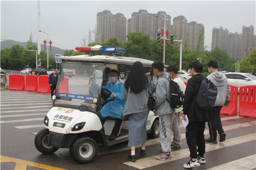 “同学们请上车,送到考场。”为方便第一次来校的学生,爱心车不断来回接送考生们;“同学,尚善楼在这边。”一路上,除了醒目的指示牌,还有志愿者们一路指引,帮助考生快速找到考场;“请同学们注意财产安全,不要丢失物品。”安保人员温馨提醒考生。