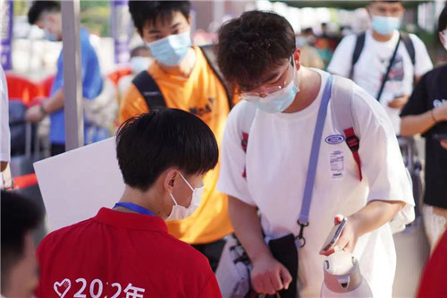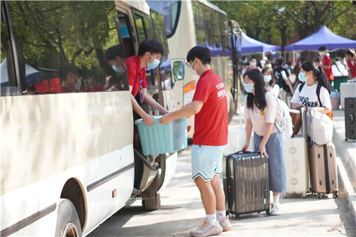 “校内安排了13辆摆渡车,往返于校门口和各学院报道点之间,一辆车一上午就跑了30多趟。”新生在通过疫情防信息控核验后,根据指引牌找到自己学院的“专属”大巴,便可乘坐大巴直达学院报到点,这一举措大大方便了携带行李的新生。