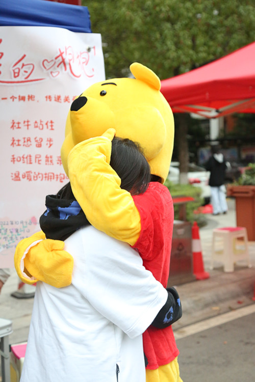 “爱的抱抱”快闪活动现场,一只形象可爱的卡通人物吸引了路过的同学们,大家纷纷上前与卡通人物拥抱合影,引导同学们用拥抱来表达善意和对生活的积极乐观态度,用行动和微笑感染周围的每一个人。